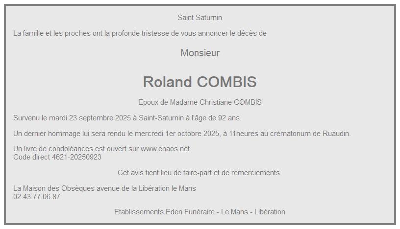 Cet espace « condoléances » est dédié à la mémoire de Monsieur Roland COMBIS.