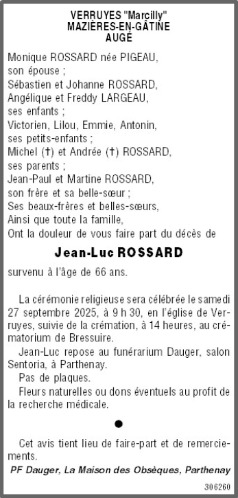 Cet espace « condoléances » est dédié à la mémoire de Monsieur Jean-Luc ROSSARD.
