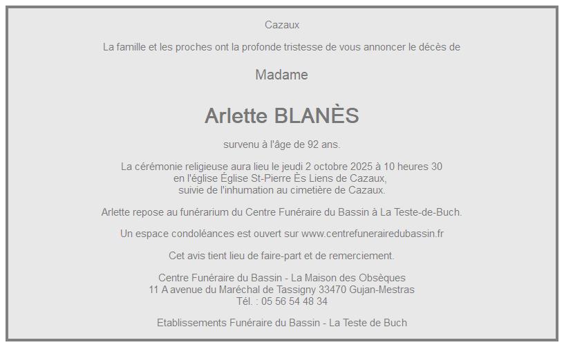 Cet espace « condoléances » est dédié à la mémoire de Madame Arlette FIOL née BLANÈS.
