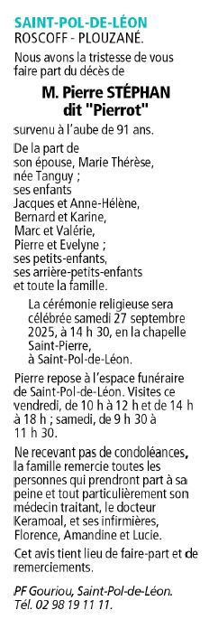 Cet espace « condoléances » est dédié à la mémoire de Monsieur Pierre STÉPHAN.