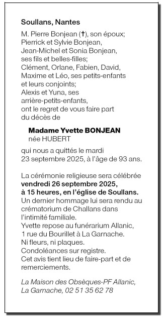 Cet espace « condoléances » est dédié à la mémoire de Madame Yvette BONJEAN née HUBERT.