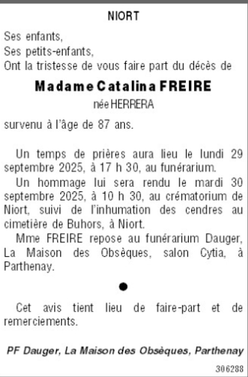 Cet espace « condoléances » est dédié à la mémoire de Madame Catalina FREIRE née HERRERA.