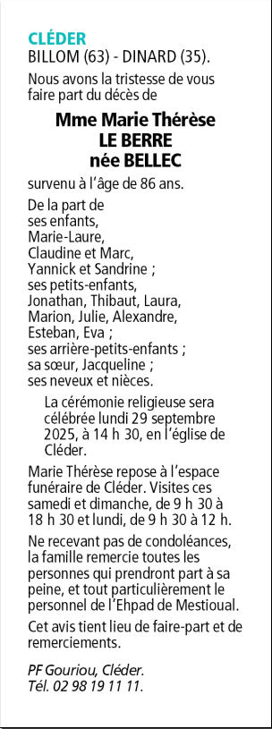 de Madame Marie Thérèse LE BERRE née BELLEC