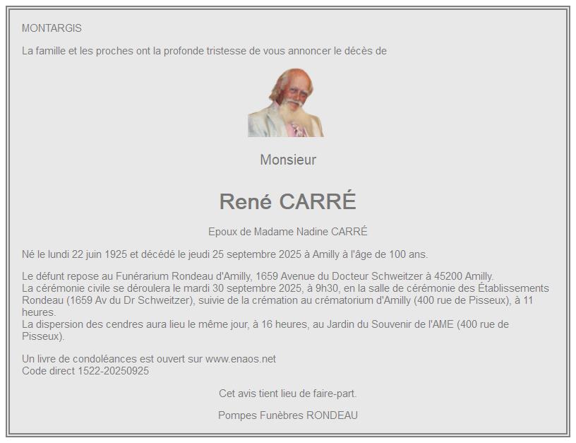 Cet espace « condoléances » est dédié à la mémoire de Monsieur René CARRÉ.