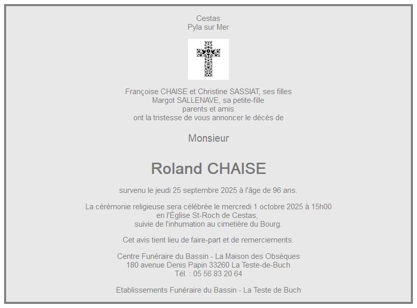 Cet espace « condoléances » est dédié à la mémoire de Monsieur Roland CHAISE.