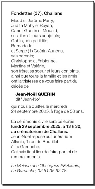 Cet espace « condoléances » est dédié à la mémoire de Monsieur Jean-Noël GUERIN.