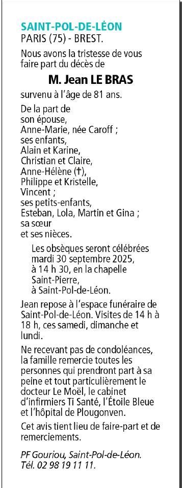 Cet espace « condoléances » est dédié à la mémoire de Monsieur Jean LE BRAS.