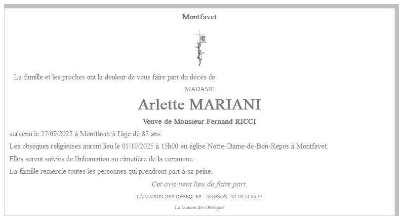 Cet espace « condoléances » est dédié à la mémoire de Madame Arlette RICCI née MARIANI.
