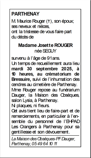 Cet espace « condoléances » est dédié à la mémoire de Madame Josette ROUGER née SEGUY.