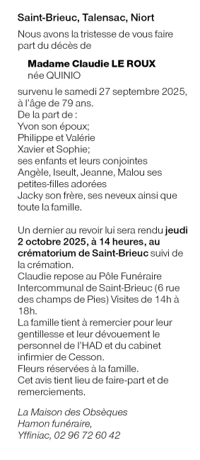 de Madame Claudie LE ROUX née QUINIO