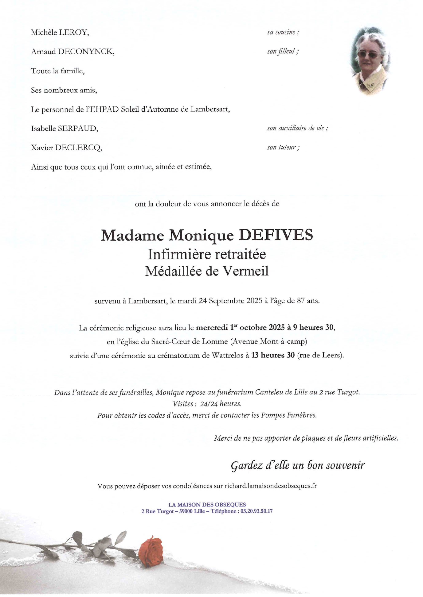 Cet espace « condoléances » est dédié à la mémoire de Madame Monique DEFIVES.