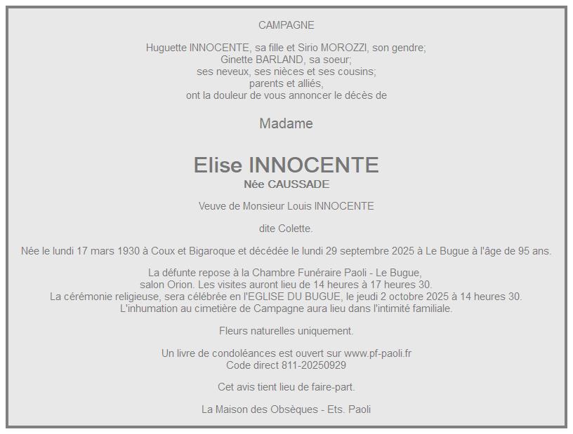 Cet espace « condoléances » est dédié à la mémoire de Madame Elise INNOCENTE née CAUSSADE.