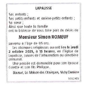 Cet espace « condoléances » est dédié à la mémoire de Monsieur Simon ROMEUF.