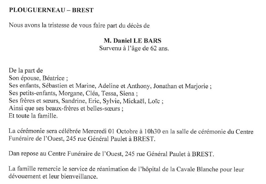 Cet espace « condoléances » est dédié à la mémoire de Monsieur Daniel LE BARS.