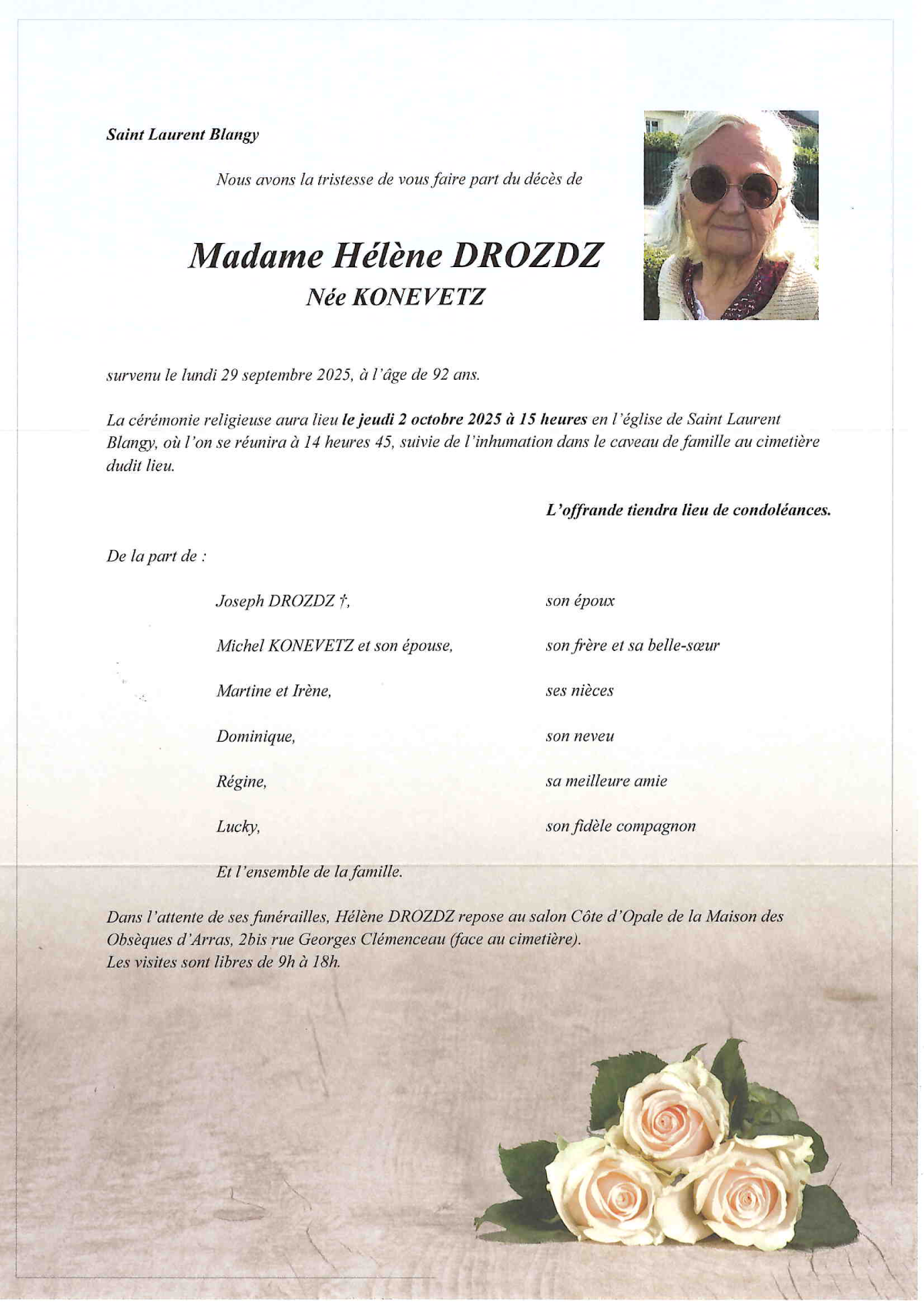 Cet espace « condoléances » est dédié à la mémoire de Madame Héléna DROZDZ née KONEVETZ.