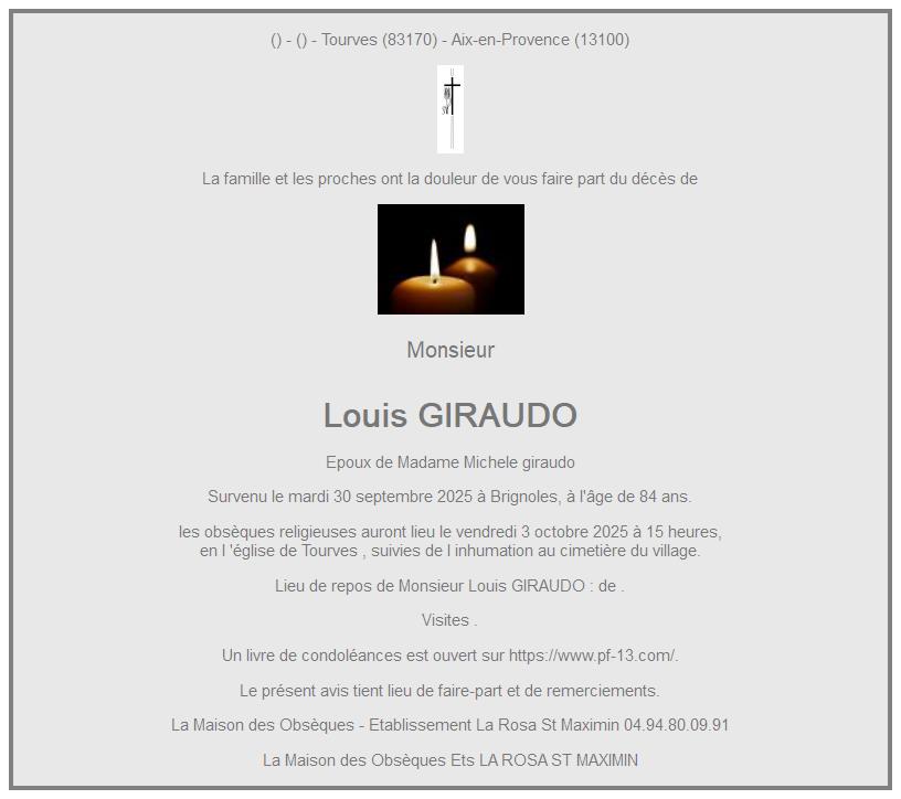 Cet espace « condoléances » est dédié à la mémoire de Monsieur Louis GIRAUDO.