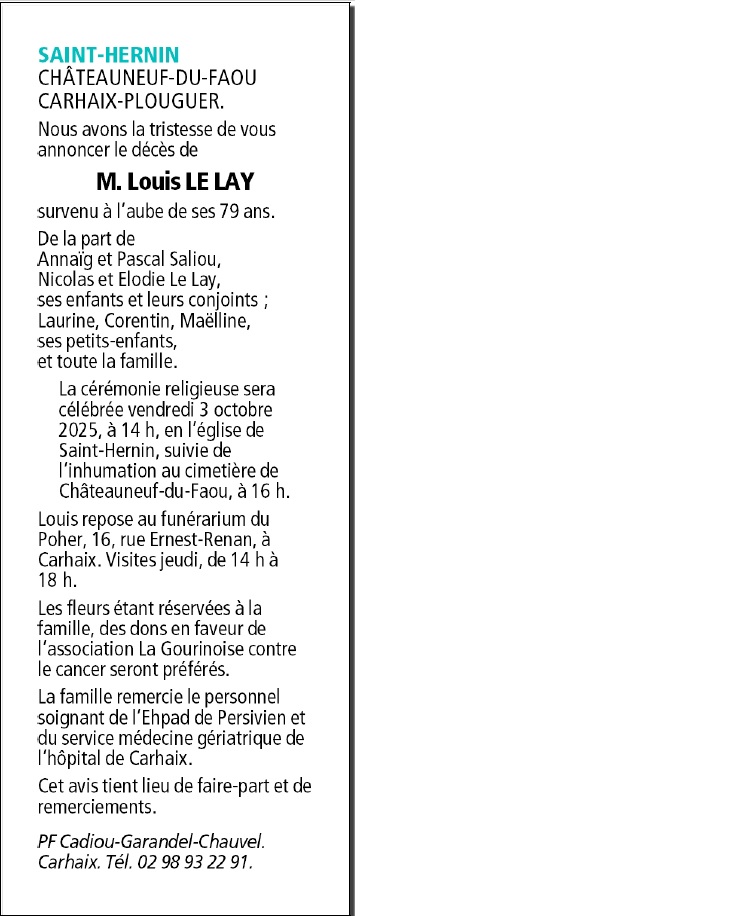 Décédé à Carhaix-Plouguer (29270) le lundi 29 septembre 2025