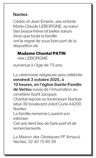 Cet espace « condoléances » est dédié à la mémoire de Madame Chantal PATIN née LEBORGNE.