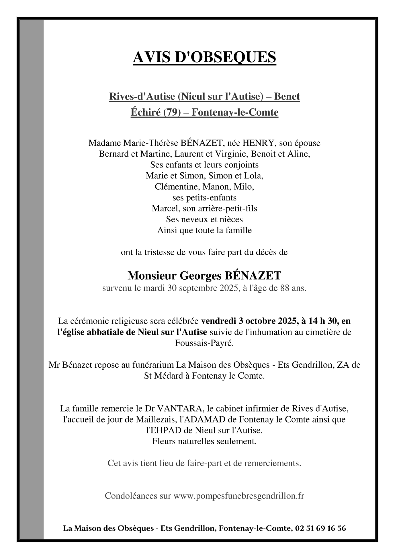 Cet espace « condoléances » est dédié à la mémoire de Monsieur Georges BÉNAZET.