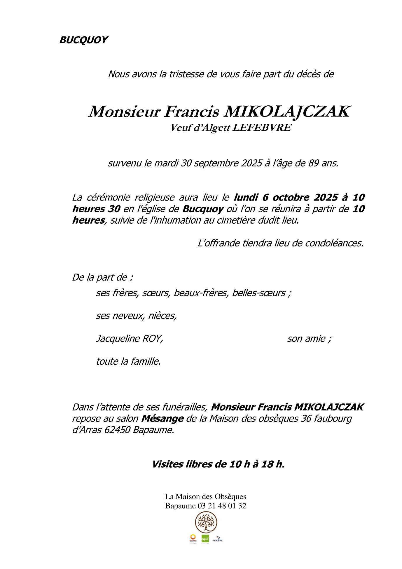 Cet espace « condoléances » est dédié à la mémoire de Monsieur Francis MIKOLAJCZAK.