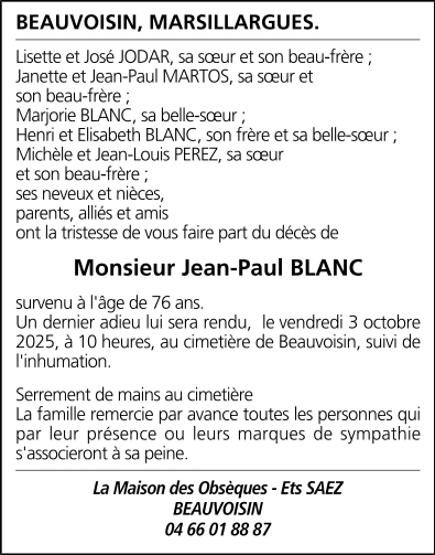 Cet espace « condoléances » est dédié à la mémoire de Monsieur Jean-Paul BLANC.
