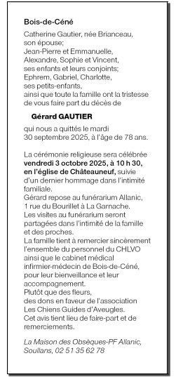 Cet espace « condoléances » est dédié à la mémoire de Monsieur Gérard GAUTIER.