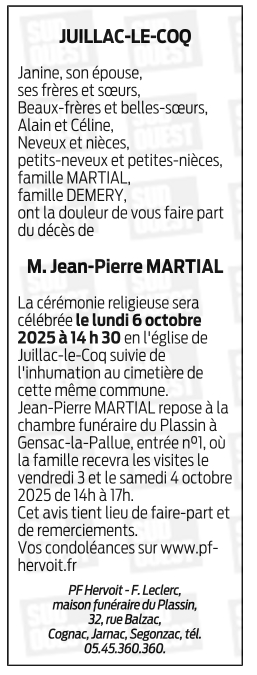 Cet espace « condoléances » est dédié à la mémoire de Monsieur Jean-Pierre MARTIAL.