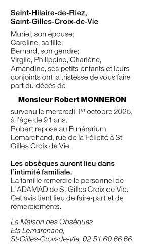 Cet espace « condoléances » est dédié à la mémoire de Monsieur Robert MONNERON.