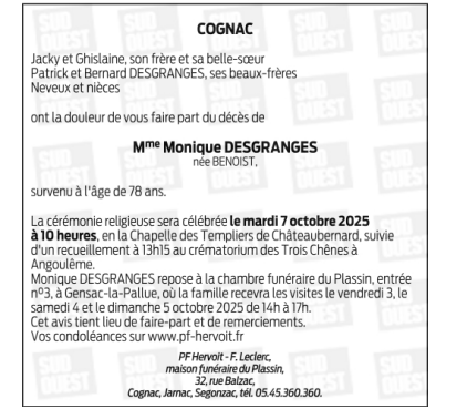 Cet espace « condoléances » est dédié à la mémoire de Madame Monique DESGRANGES née BENOIST.