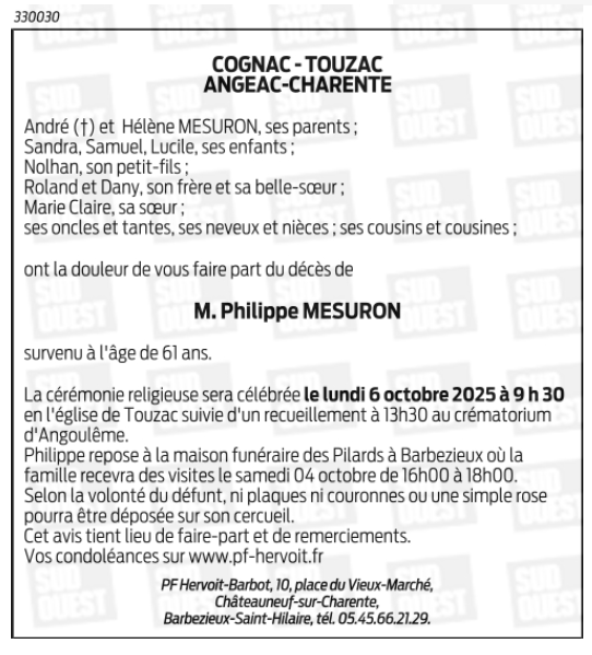 Cet espace « condoléances » est dédié à la mémoire de Monsieur Philippe MESURON.