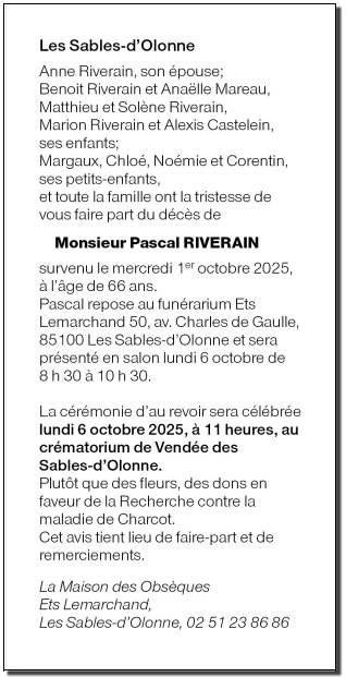 Cet espace « condoléances » est dédié à la mémoire de Monsieur Pascal RIVERAIN.