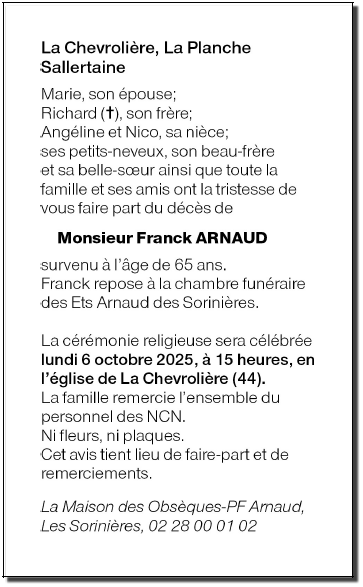 Cet espace « condoléances » est dédié à la mémoire de Monsieur Franck ARNAUD.