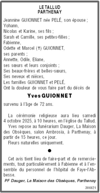 Décédé à Faye-l'Abbesse (79350) le mercredi 1 octobre 2025