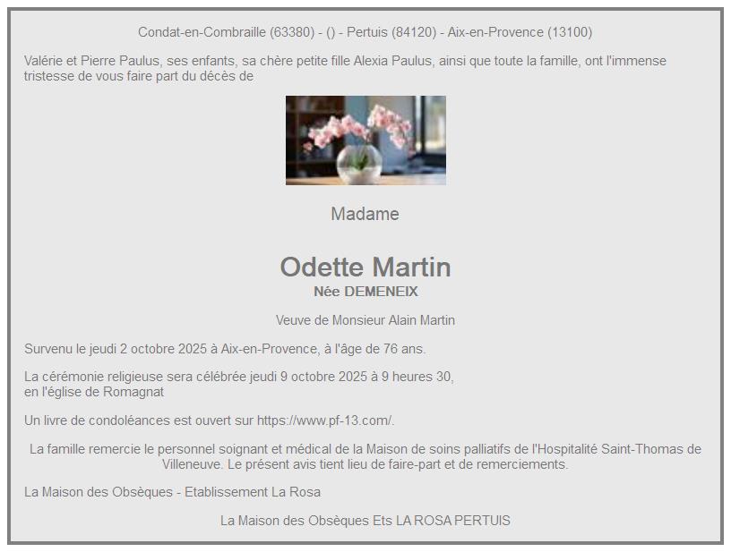 Cet espace « condoléances » est dédié à la mémoire de Madame Odette Martin née DEMENEIX.