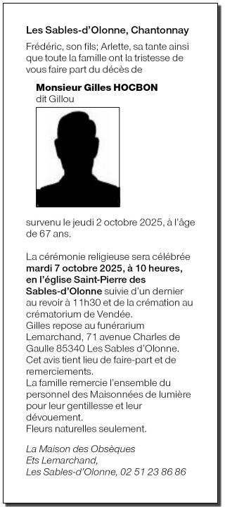 Cet espace « condoléances » est dédié à la mémoire de Monsieur Gilles HOCBON.