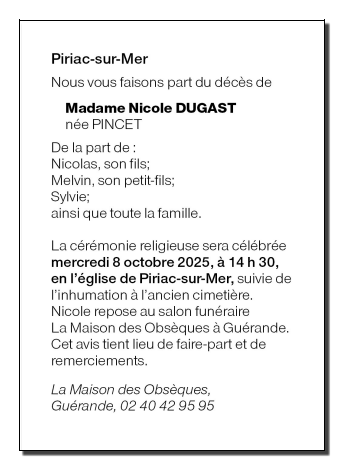 Cet espace « condoléances » est dédié à la mémoire de Madame NICOLE DUGAST née PINCET.