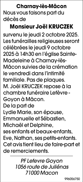 Cet espace « condoléances » est dédié à la mémoire de Monsieur Joël KRUCZEK.