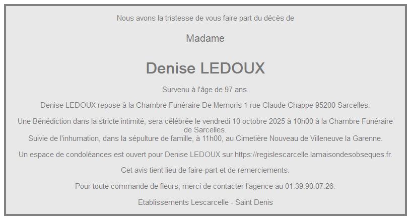 Cet espace « condoléances » est dédié à la mémoire de Madame Denise LEDOUX.