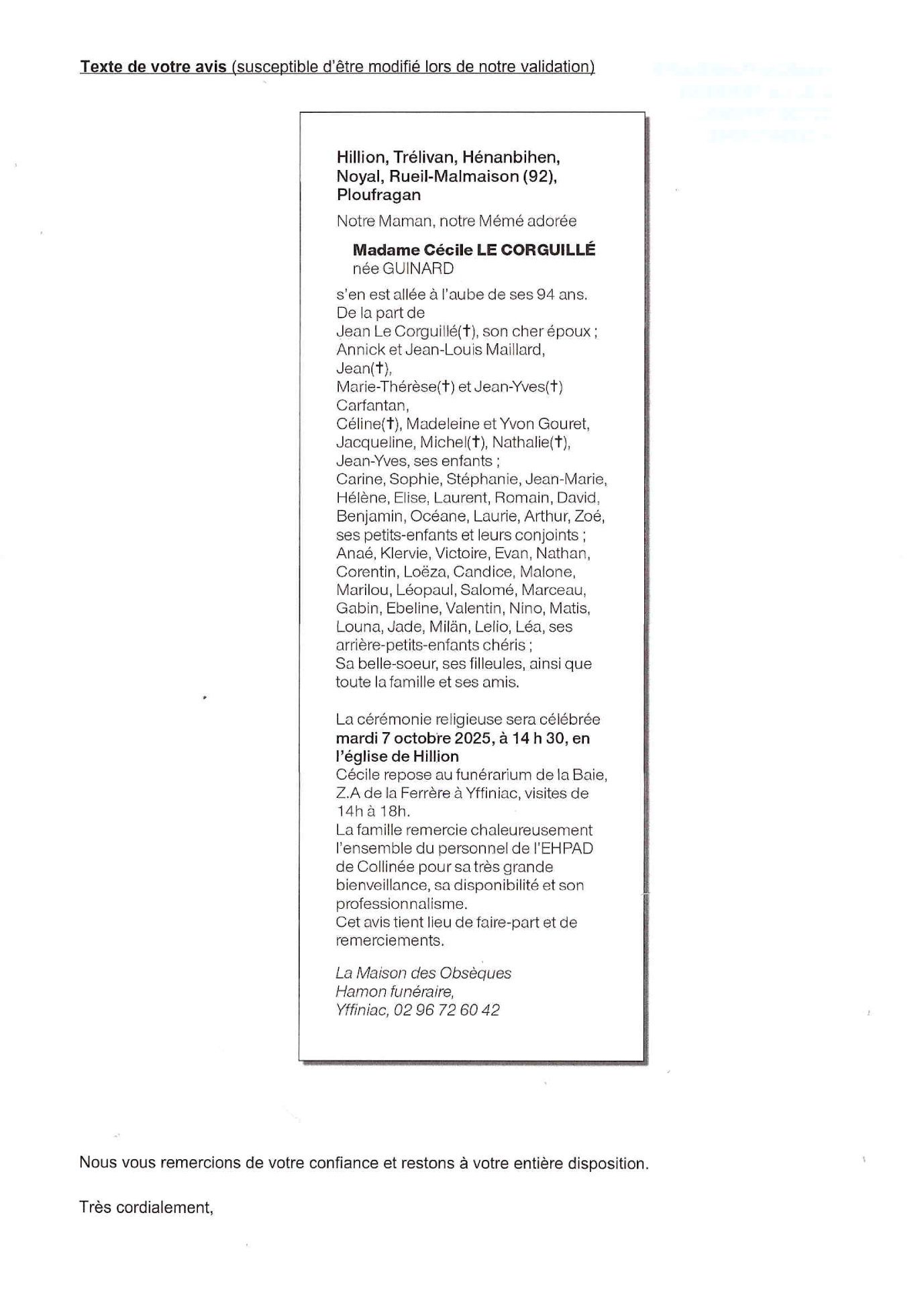 de Madame Cécile LE CORGUILLÉ née GUINARD