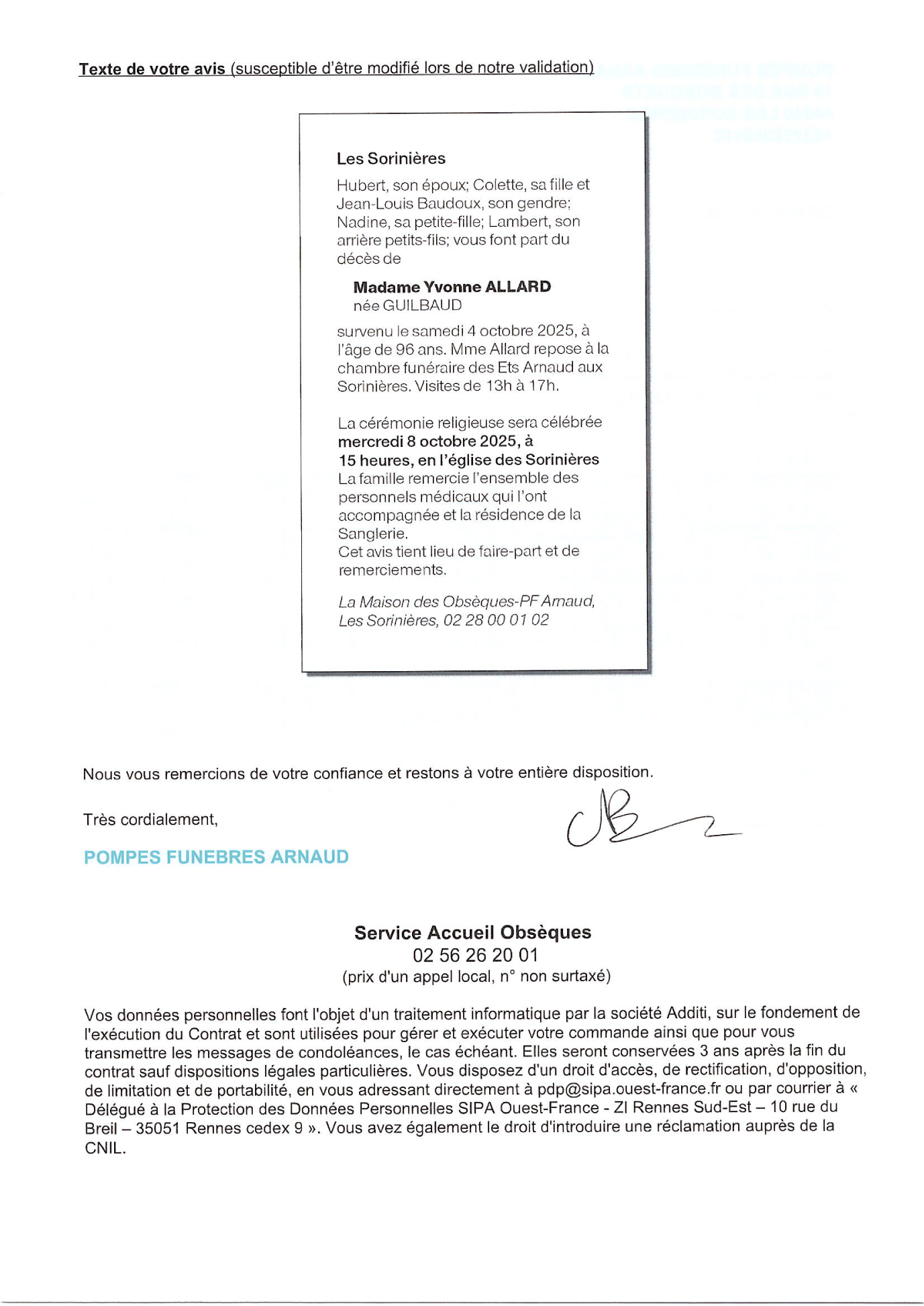 Cet espace « condoléances » est dédié à la mémoire de Madame Yvonne ALLARD née GUILBAUD.