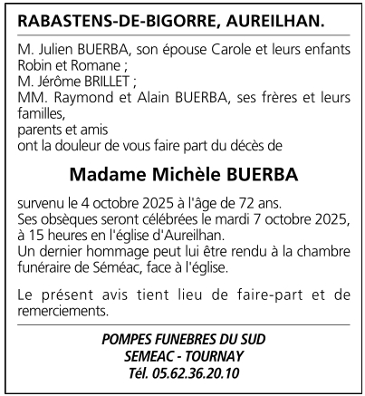 Cet espace « condoléances » est dédié à la mémoire de Madame Michelle BUERBA.