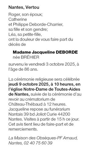 de Madame Jacqueline DEBORDE née BRÉHIER