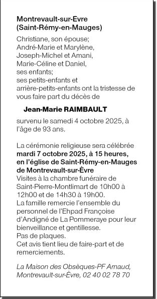 Cet espace « condoléances » est dédié à la mémoire de Monsieur Jean-Marie RAIMBAULT.