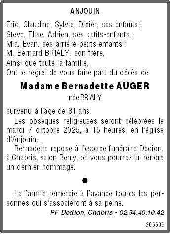 Cet espace « condoléances » est dédié à la mémoire de Madame Bernadette AUGER née BRIALY.