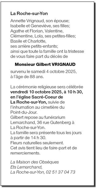 Cet espace « condoléances » est dédié à la mémoire de Monsieur Gilbert VRIGNAUD.