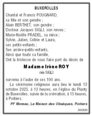Cet espace « condoléances » est dédié à la mémoire de Madame Irène ROY née SIGLI.