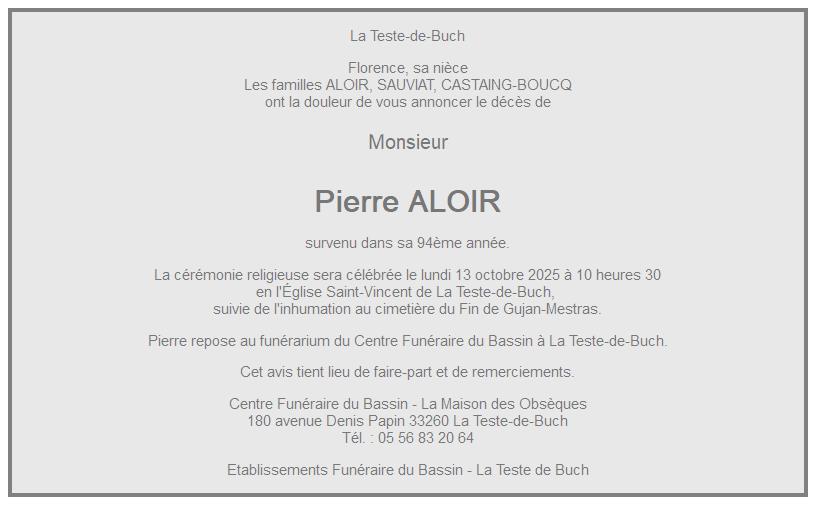 Cet espace « condoléances » est dédié à la mémoire de Monsieur Pierre ALOIR.
