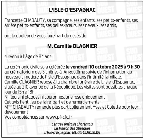 Cet espace « condoléances » est dédié à la mémoire de Monsieur Camille OLAGNIER.