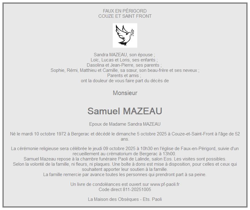 Cet espace « condoléances » est dédié à la mémoire de Monsieur Samuel MAZEAU.