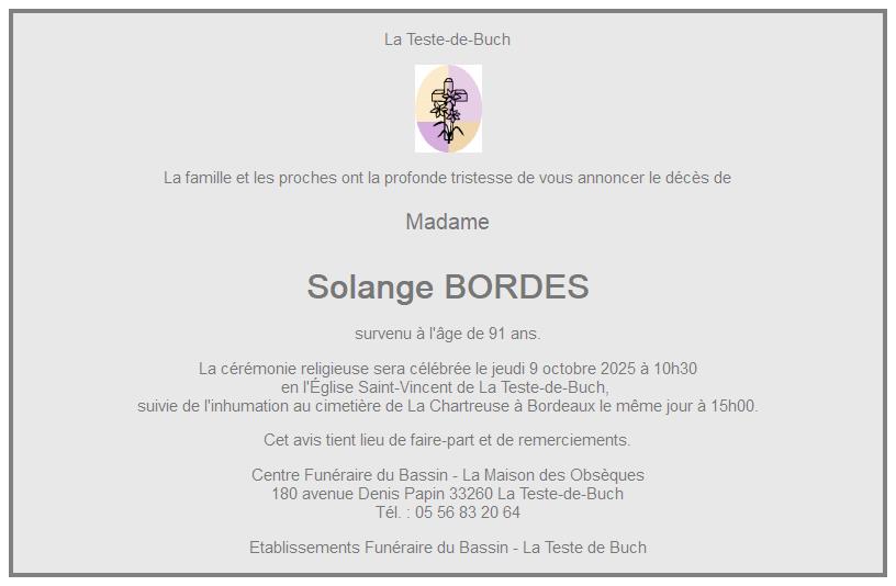 Cet espace « condoléances » est dédié à la mémoire de Madame Solange BORDES.